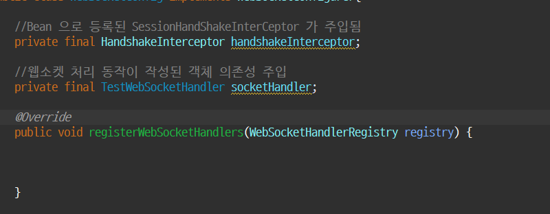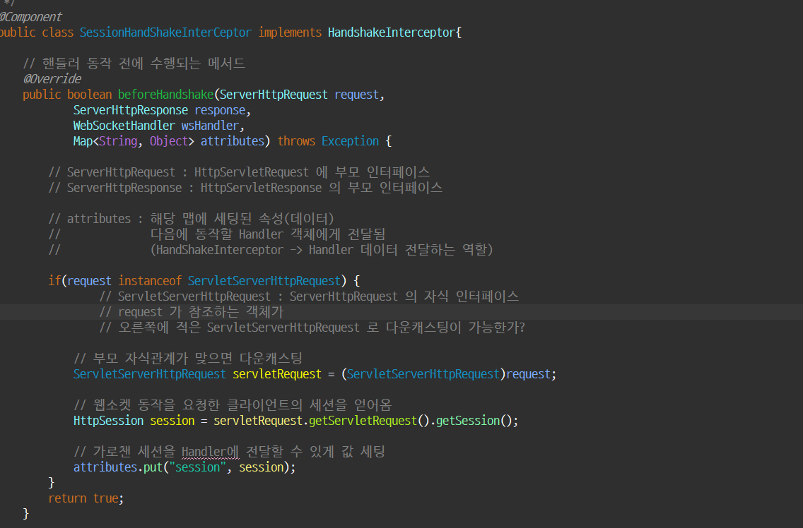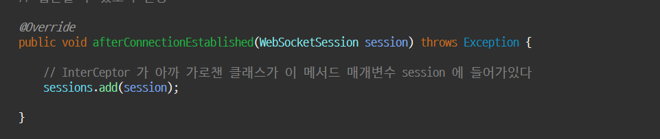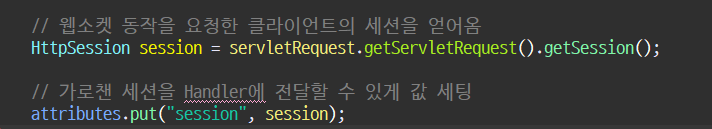 전에 만들었던 클래스에서 session을 가로채 websocketsession 에다가 넣어줌