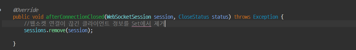 void afterConnectionClosed(WebSocketSession session, CloseStatus closeStatus)