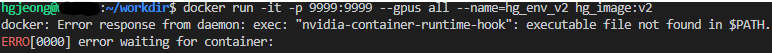 hgjeong:~/workdir$ docker run -it -p 9999:9999 --gpus all --name=hg_env_v2 hg_image:v2