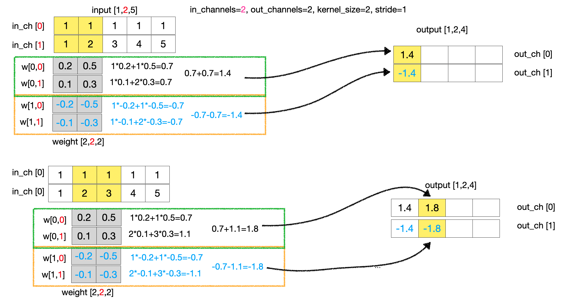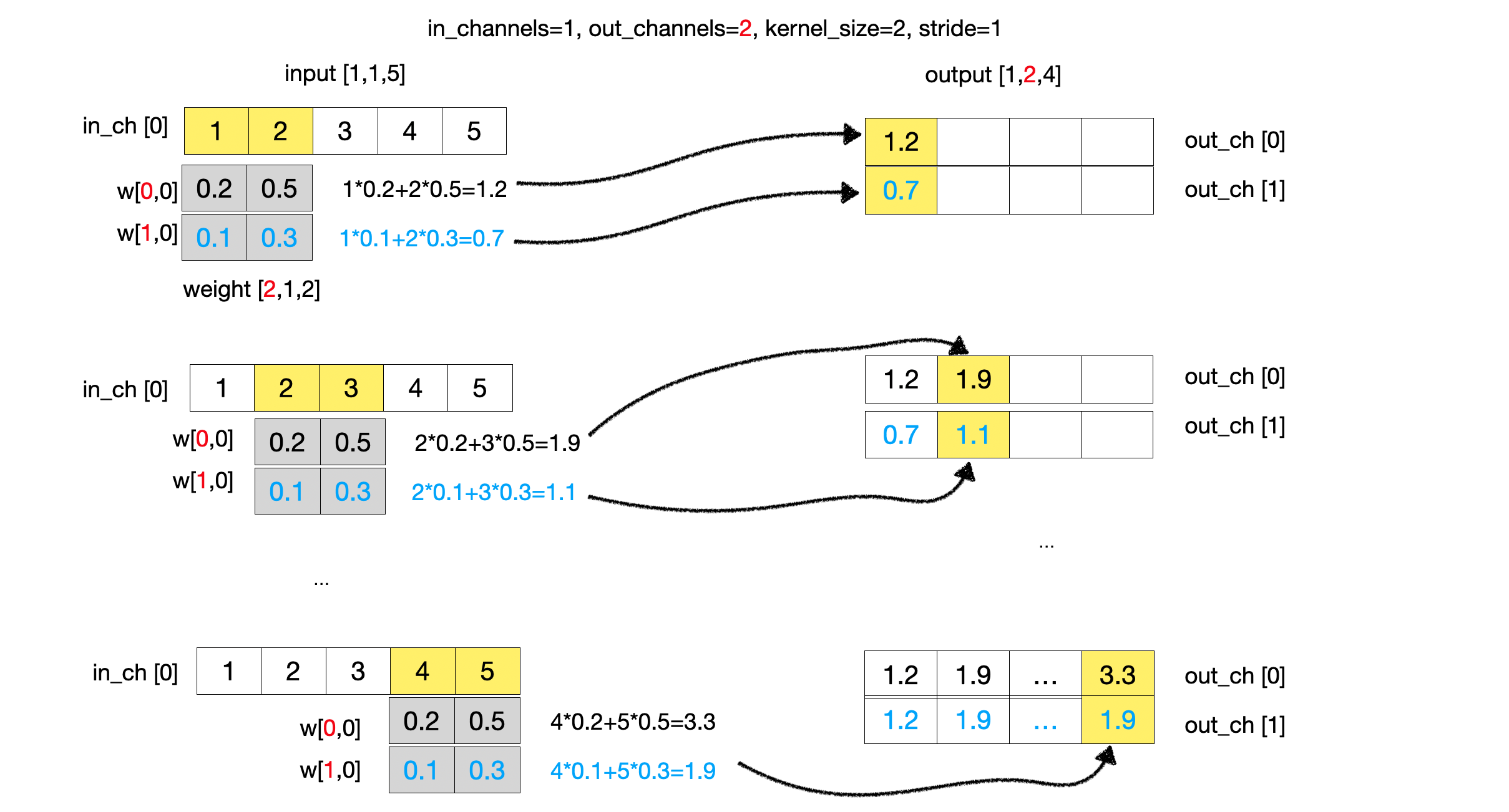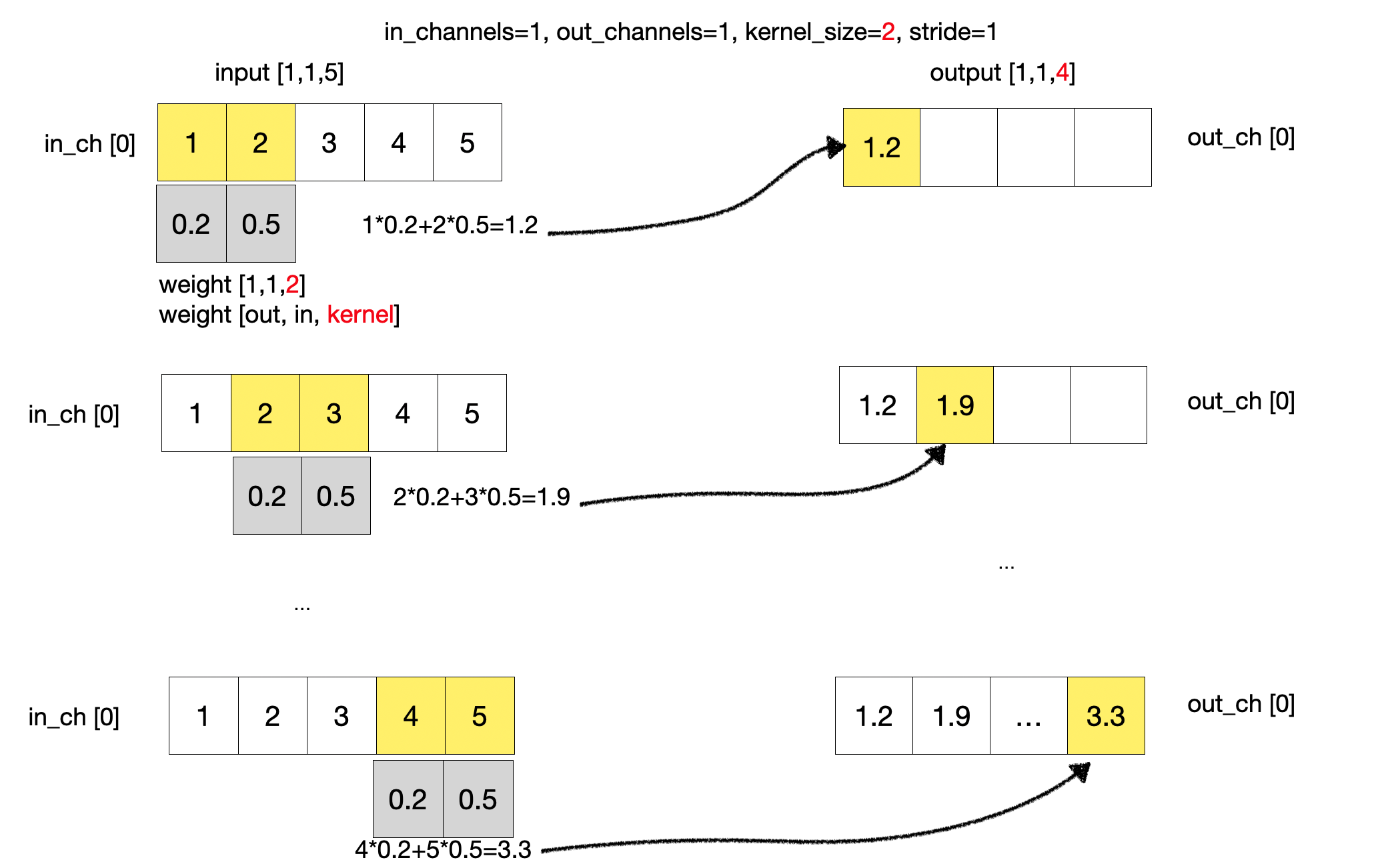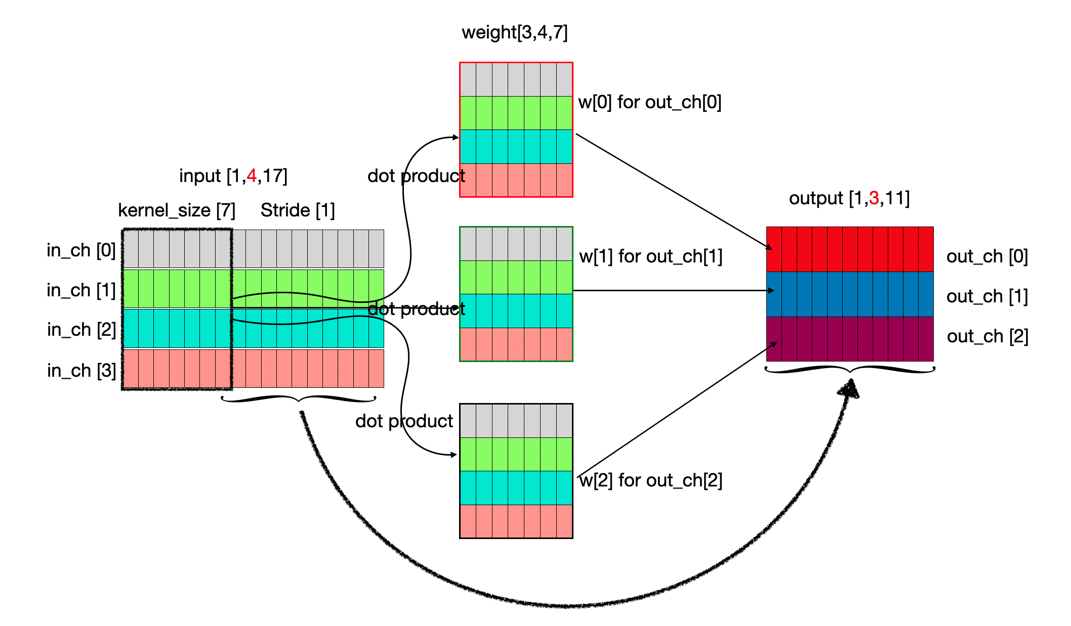 첫번째 입력 데이터에서 시작위치에서 4x7의 데이터를 선택해서 각각의 출력 데이터를 위한 커널과 dot product를 수행하면 출력 채널별로 하나의 숫자가 나오고 이것을 출력 데이터 첫번채 열에 추가한다. 다음으로 입력 신호에서 1 time step(stride=1) 을 이동해서 4x7 데이터를 선택하고 3개의 커널과 dot product을 수행하고 출력 데이터의 2번째 열에 추가한다. 이렇게 계속 반복하면 출력데이터는 1x3x7 형태를 가지게 된다. 입력, 출력, 커널의 변화에 따라 어떻게 달라지는지를 알아보기로 하자.