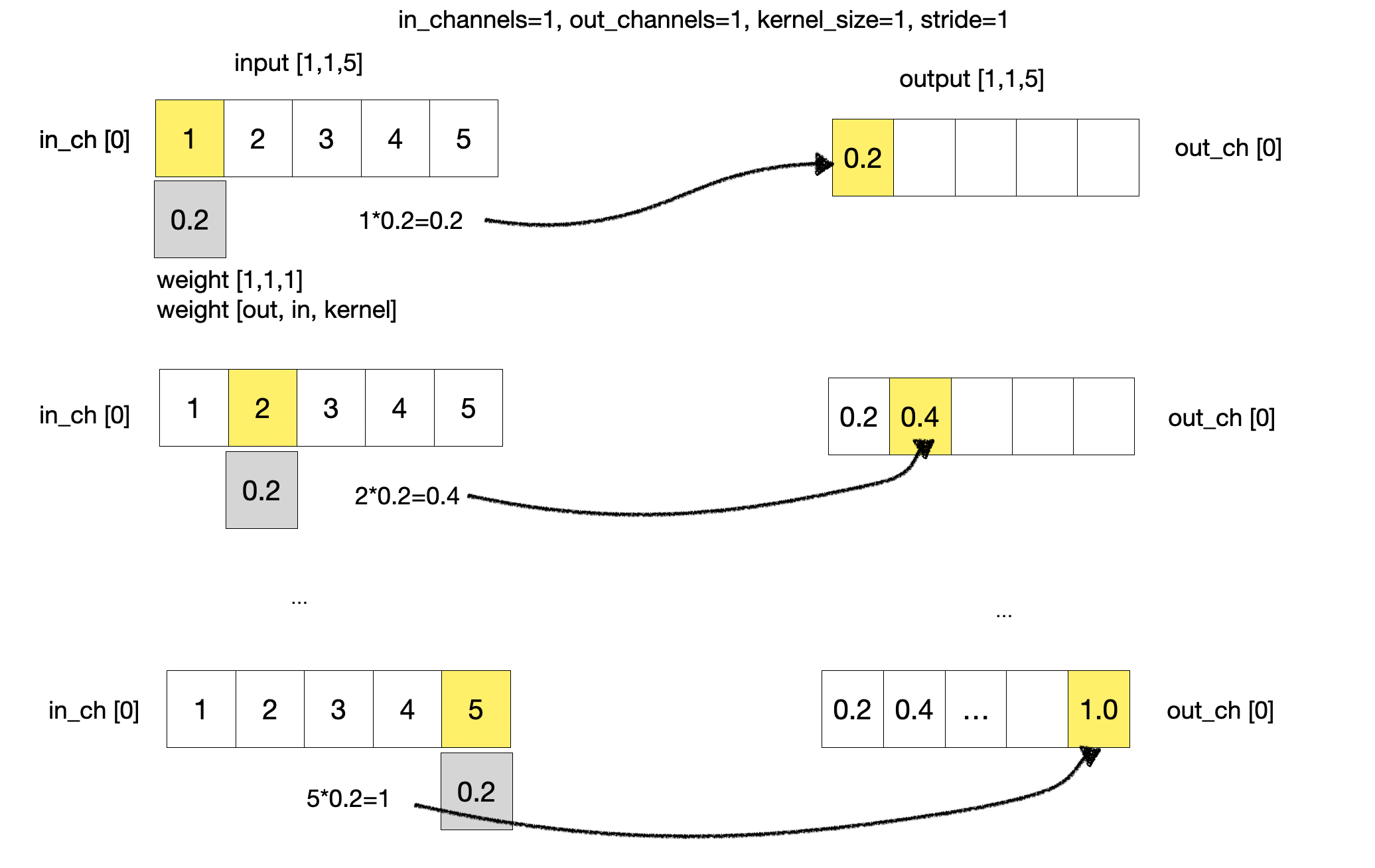입력, 출력, 커널의 변화를 살펴보기 위해 이를 좀 더 단순화 해서 살펴보자. 가장 단순한 형태로 입력 채널은 1차원, 출력 채널은 1 커널 사이즈는 1로 가정해보자. 입력 데이터는 1,2,3,4,5로 구성되고 커널의 초기값은 0.2로 가정하자. 커널은 하나씩 이동하면서 입력신호와 곱해서 출력을 만든다.