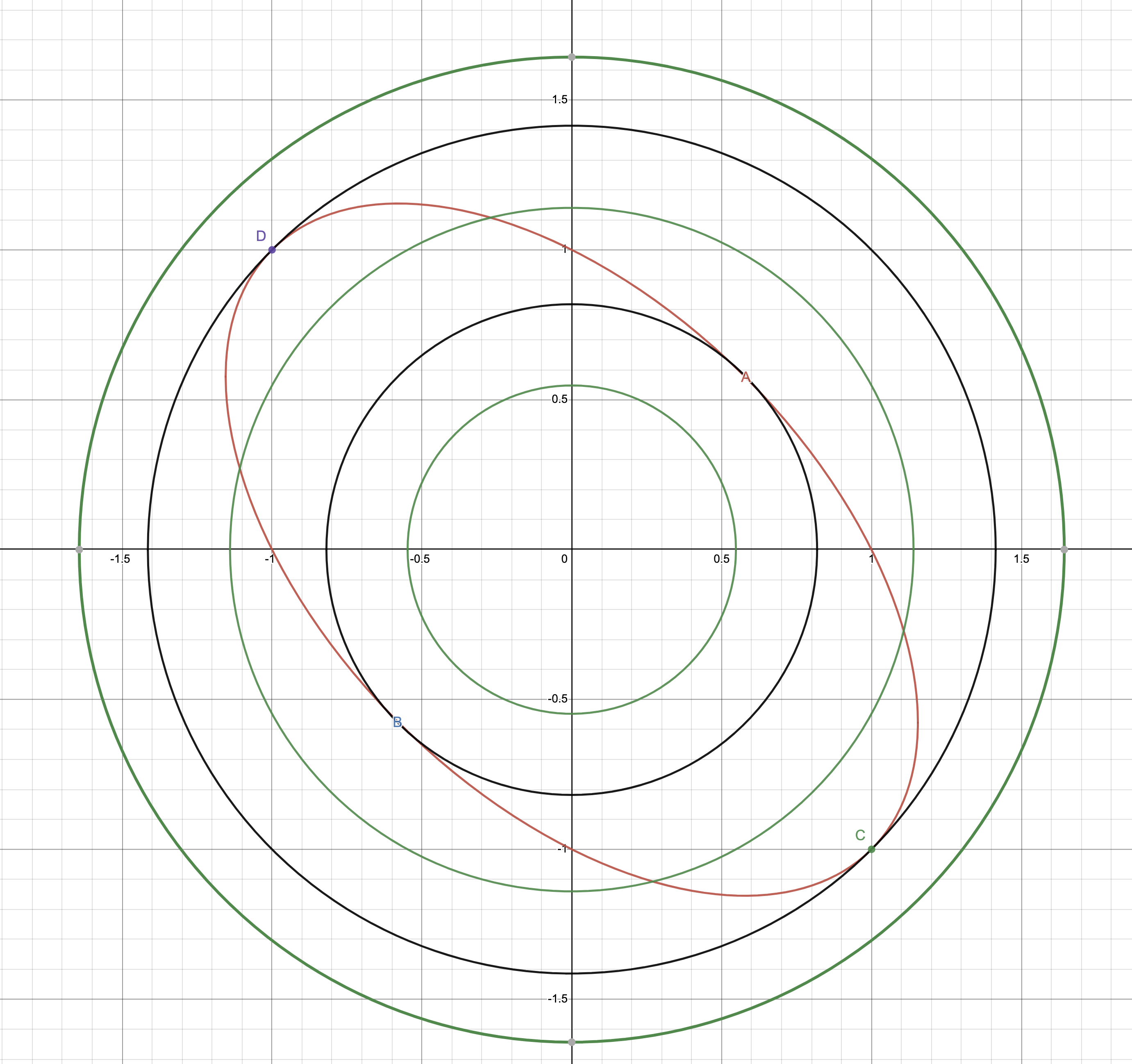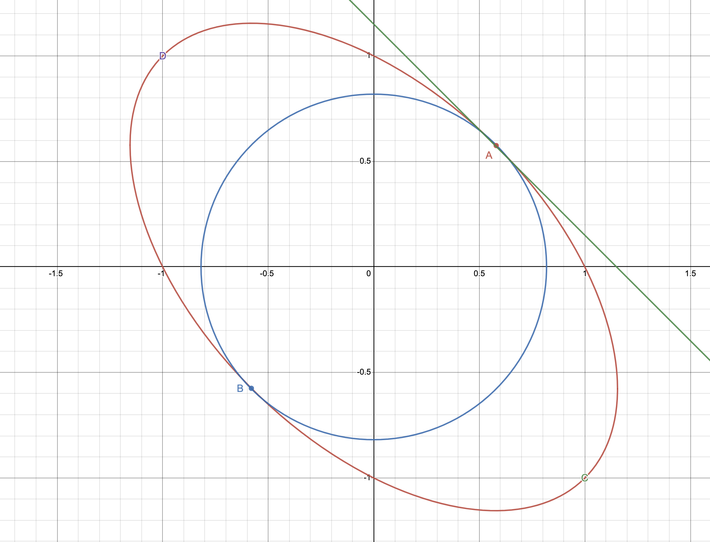 x 2 + x y + y 2 = 1 x^2+xy+y^2=1 x 2 + x y + y 2 = 1 일때, x 2 + y 2 x^2+y^2 x 2 + y 2 최대값과 최소값을 구하는 문제를 생각해보자. 아래 그림에서 볼수 있는 것과 같이 원의 방정식 x 2 + y 2 x^2+y^2 x 2 + y 2 은 반지름을 0에서 조금씩 확대함에 따라 x 2 + x y + y 2 = 1 x^2+xy+y^2=1 x 2 + x y + y 2 = 1 함수와 x 2 + y 2 = r x^2+y^2=r x 2 + y 2 = r 이 점하는 A,B 지점이 r이 최소가 되는 지점이고, C,D 지점에서 r이 최대인 지점이 된다. 따라서 두 함수가 접할때 r을 구하면 그 r 값이 최대, 최소값이 될 것이다.