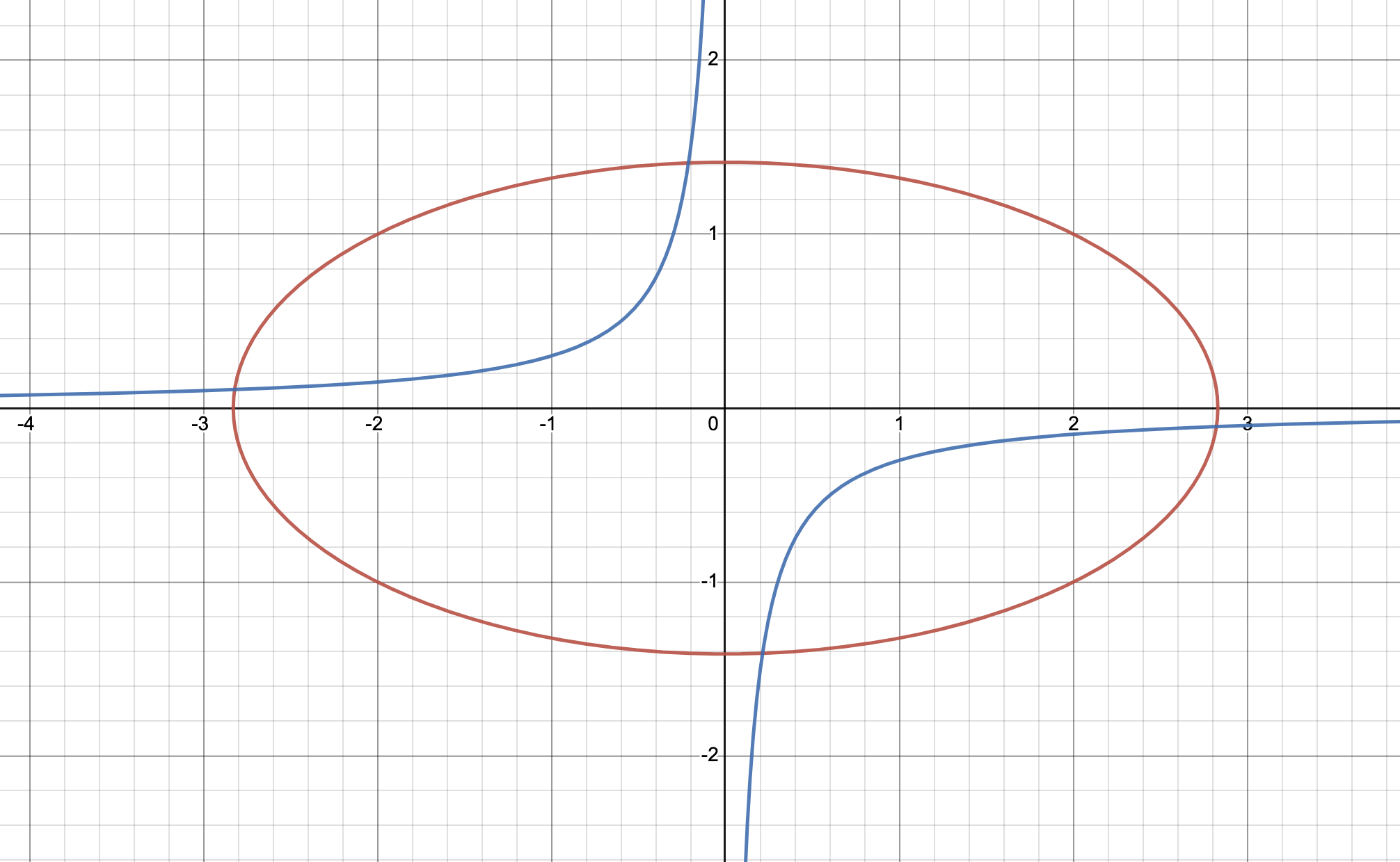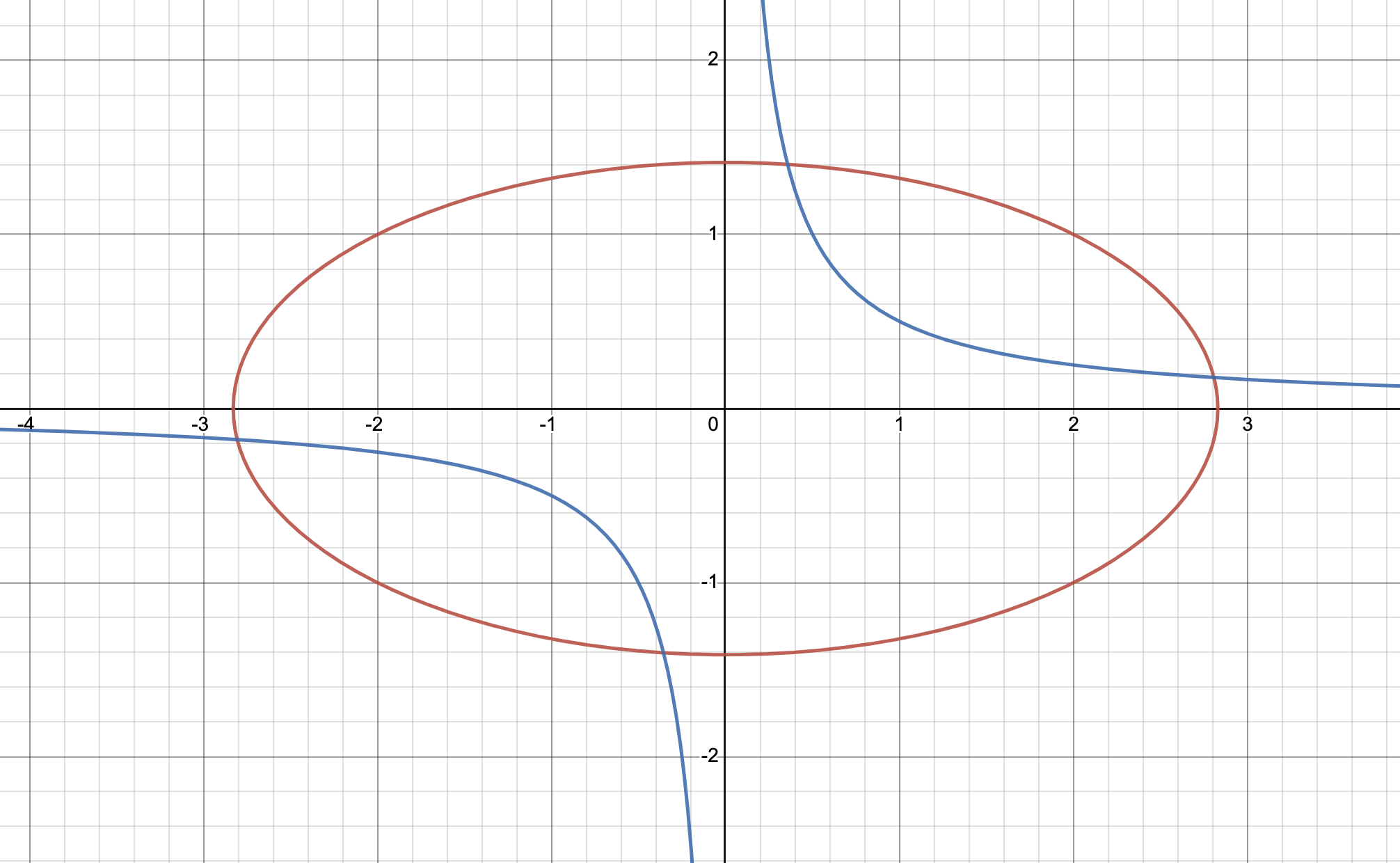 그래프에서 살펴보면 g ( x , y ) g(x,y) g ( x , y ) 는 타원이 되고, f ( x , y ) f(x,y) f ( x , y ) 는 x x x 값에 따라 반비례 그래프가 된다.