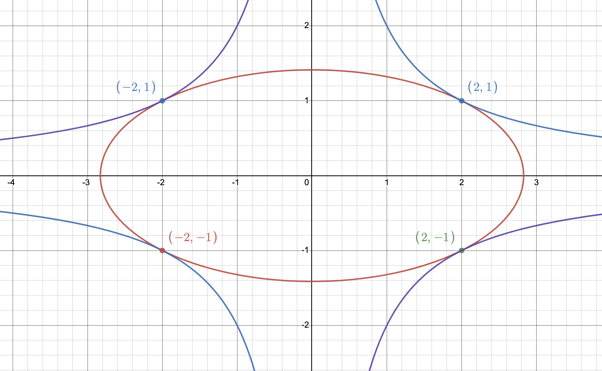 x = 2 y 1 − ( 2 y ) 2 8 − y 2 2 = 1 − y 2 = 0 ∴ x = ± 2 , y = ± 1 ( x , y ) = ( ± 2 , ± 1 ) x=2y \\ 1-\frac{(2y)^2}{8}-\frac{y^2}{2}=1-y^2=0\\ \therefore x=\pm 2, y=\pm 1\\ (x,y)=(\pm 2, \pm 1) x = 2 y 1 − 8 ( 2 y ) 2 − 2 y 2 = 1 − y 2 = 0 ∴ x = ± 2 , y = ± 1 ( x , y ) = ( ± 2 , ± 1 )
