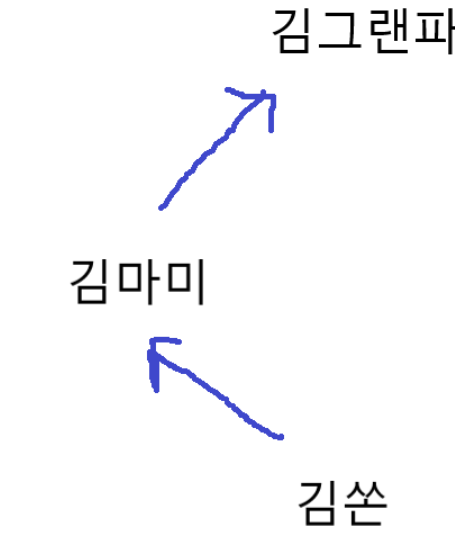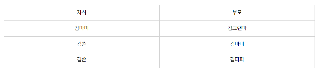 김쏜 - 김마미 , 김마미 - 김그랜파 는 각각 자식 - 부모 관계를 구축한다.
