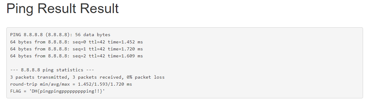 Ping 버튼을 입력하면 내부에서는 ping -c 3 "[InputBox에서 입력한 내용]"을 실행시켜 결과를 Result 화면에 뛰운다는 거다. 그러면 세미콜론을 이용해 명령어를 두 번 이상 실행시킬 수 있다면 flag 값을 얻을 수 있다.