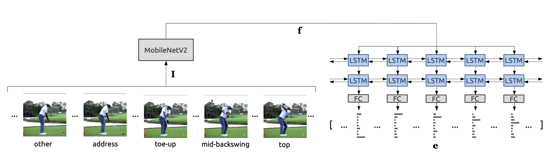 이건 SwingNet 안에서 LSTM이 작동하는 구조다. 골프 스윙과 같은 스포츠 동작은 시간에 따라 변하는 연속적인 데이터 이다. 각 순간의 동작이 이전의 동작과 연관되기 때문에, 단일 프레임을 사용해 골프의 swing event를 감지하는 것은 어려운 작업이다. 따라서 시간적 context가 중요한 요소가 되는데,