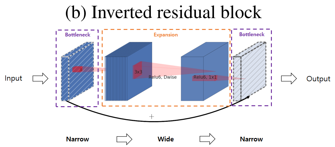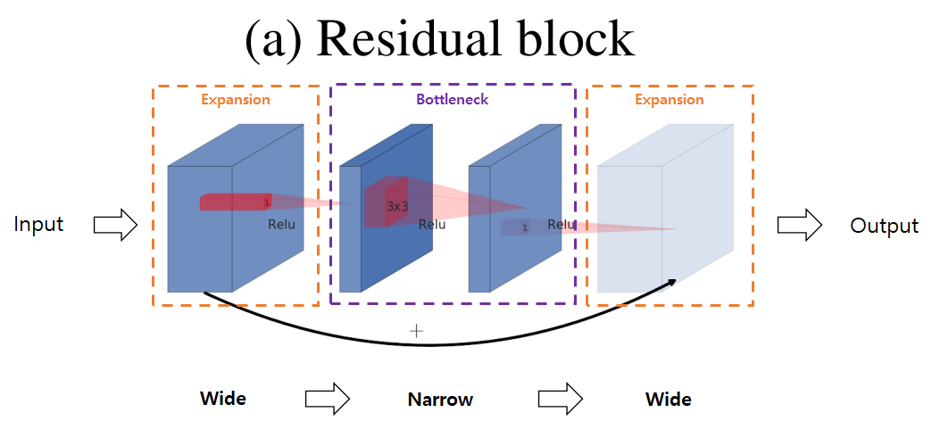 입/출력의 채널수가 낮기 때문에 Residual Block에 비해 연산량이 적고 메모리 효율이 좋음