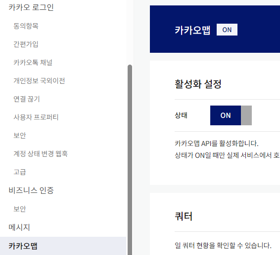 좌측 메뉴 → 카카오맵 → 활성화 ON
