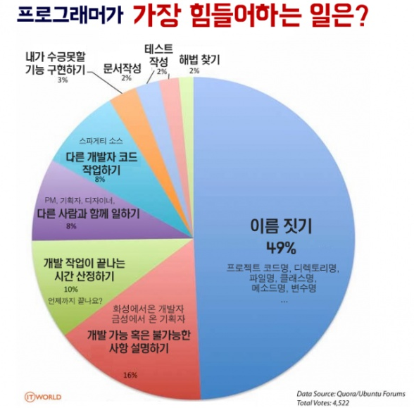 처음 프로그래밍을 배울때(약 10여년전) 변수명을 a, b, c 따위로 정하고 주석으로 설명을 적으라고 배웠는데, 요즘은 의미 있는 이름으로 변수명을 적는다고 하여 변수명을 변경 하였다.