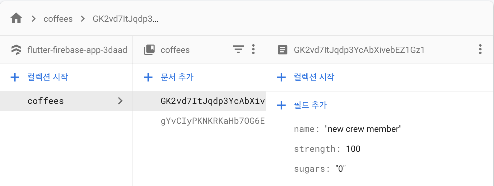 거의 대부분은 동일한데, 회원가입을 할 경우 firestore에서 자동으로 coffees collection이 생성됩니다.생성된 collection의 내부는 user 들의 uid들이 document에 생성되며, 현재는 document 내부의 name, strength, sugars 필드가 기본값으로 생성되도록 '하드코딩'설정되어 있습니다.