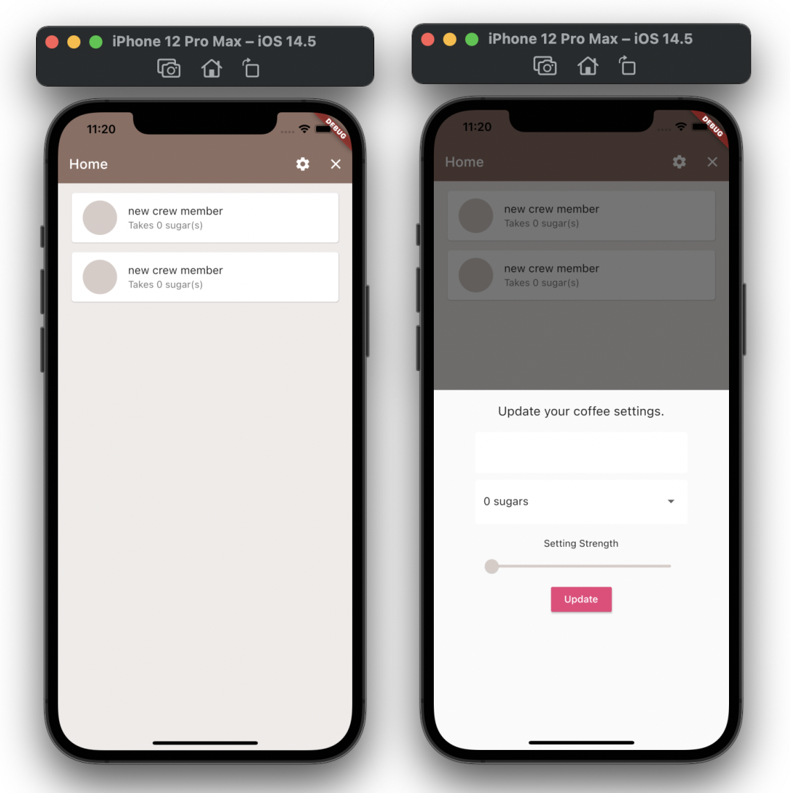 home screen의 설정버튼을 누르면 bottom sheet가 나타나며, 설정값을 입력하고 update 버튼을 누르면 firestore 에 설정되어있는 해당 uid document 의 필드값이 변경되도록 해요.