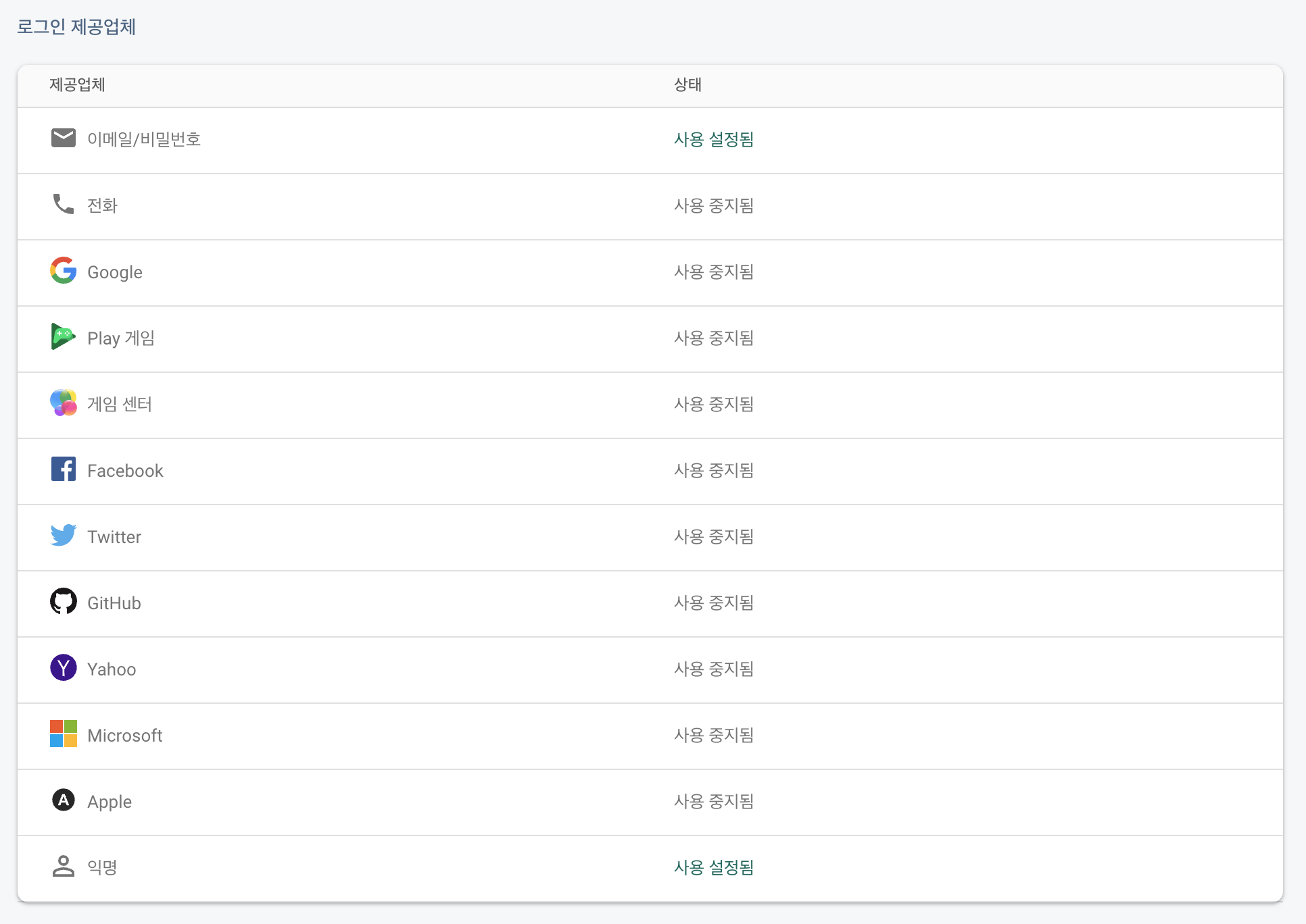 로그인과정을 위해 firebase authentication에서 이메일/비밀번호와, 익명 로그인을 '사용설정됨'으로 활성화 시켜줘요.