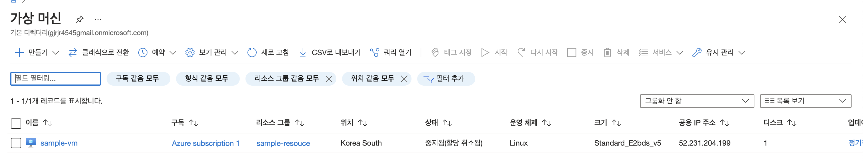 Azure portal에서 확인하면 해당 VM이 중지되어 있음을 확인 할수 있다.