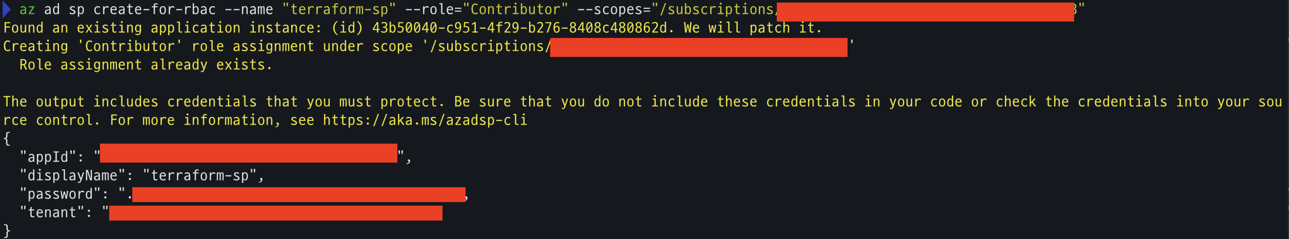 az ad sp create-for-rbac --name "terraform-sp" --role="Contributor" --scopes="/subscriptions/<SUBSCRIPTION_ID>"