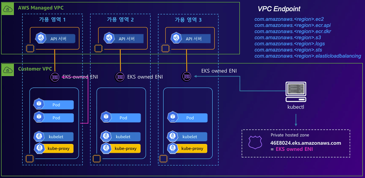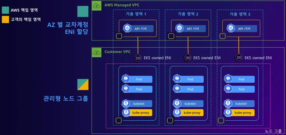 EKS에서 Control Plane 생성시 고가용성 확보 목적으로 여러 가용 영역에 걸처서 생성합니다.