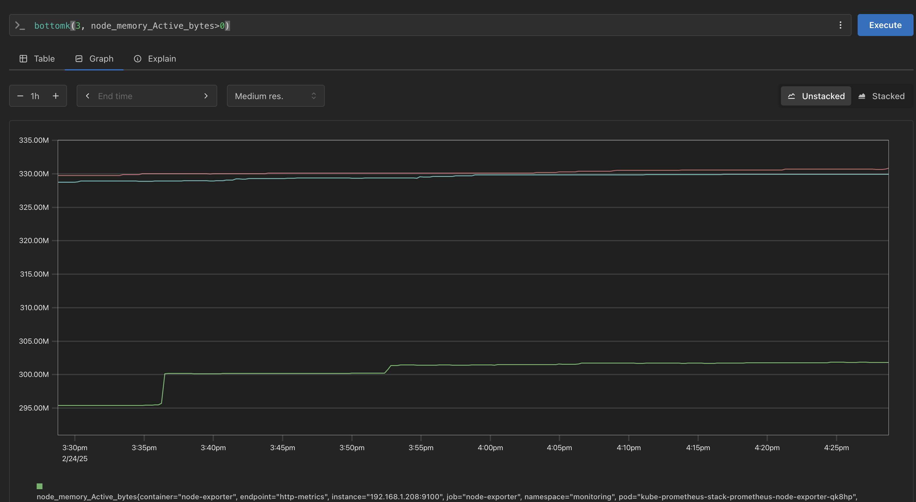 bottomk(3, node_memory_Active_bytes>0)
