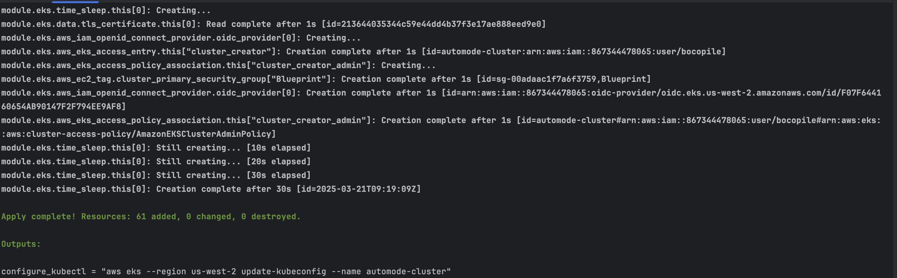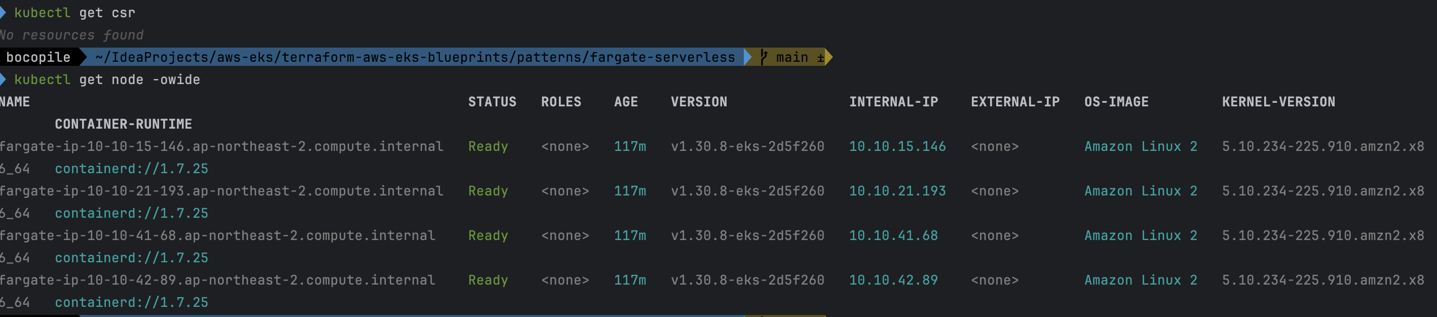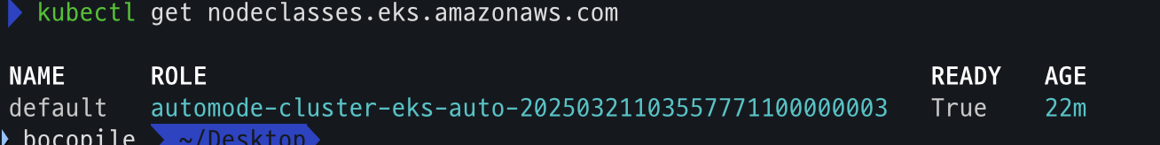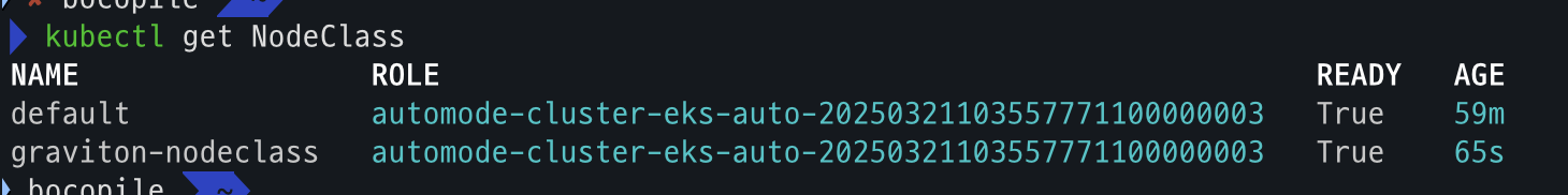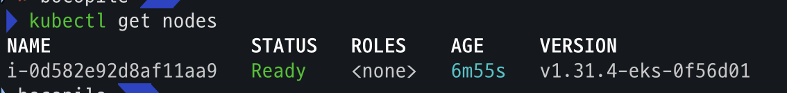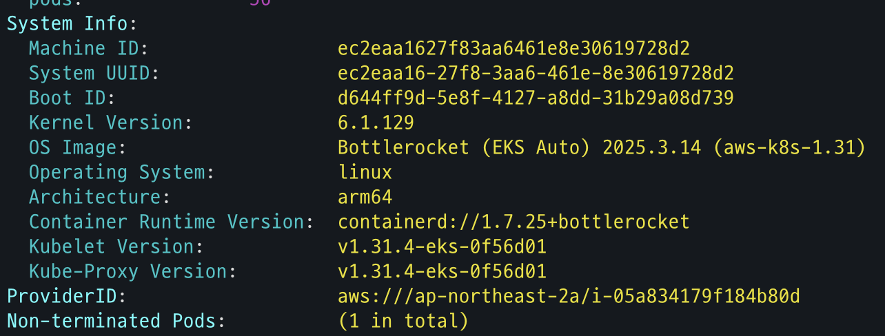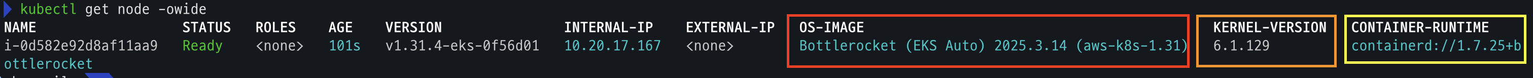 i-09cf206aee76f0bee Ready <none> 2m14s v1.31.4-eks-0f56d01 10.20.44.40 <none> Bottlerocket (EKS Auto) 2025.3.9 (aws-k8s-1.31) 6.1.129 containerd://1.7.25+bottlerocket