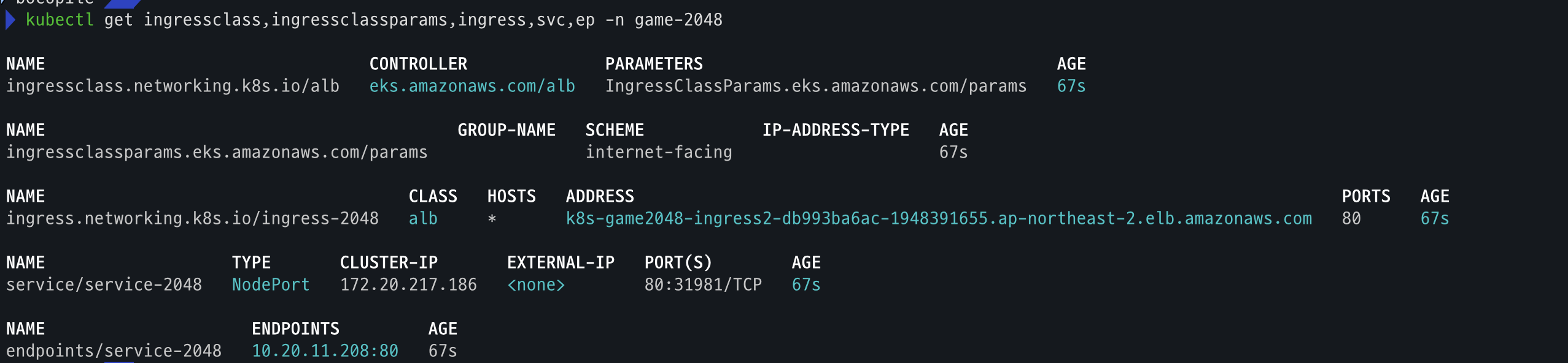 kubectl get ingressclass,ingressclassparams,ingress,svc,ep -n game-2048