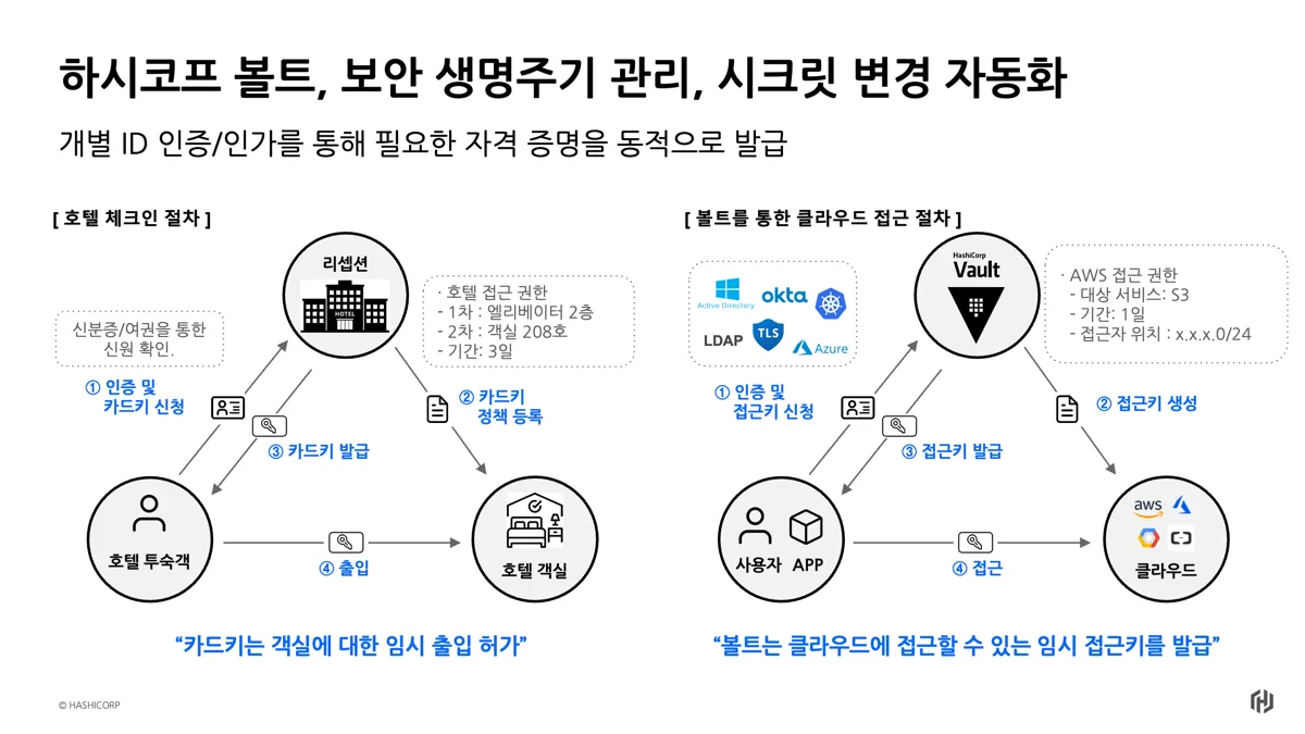 현대 기업들이 겪는 자격 증명 관리의 보안 위험과 복잡성을 해결하기 위해, HashiCorp Vault는 모든 시크릿을 중앙 집중화하여 안전하게 관리하고, 인증·인가·감사 로그를 통해 접근을 제어합니다.