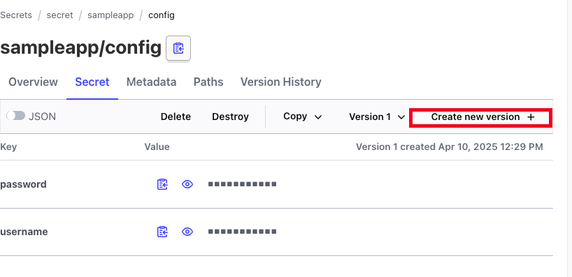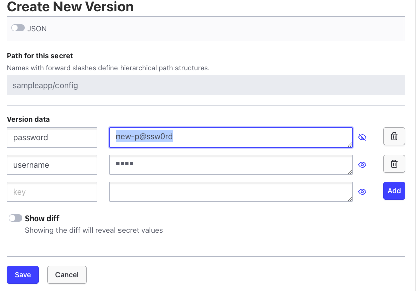 vault kv put secret/sampleapp/config \