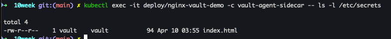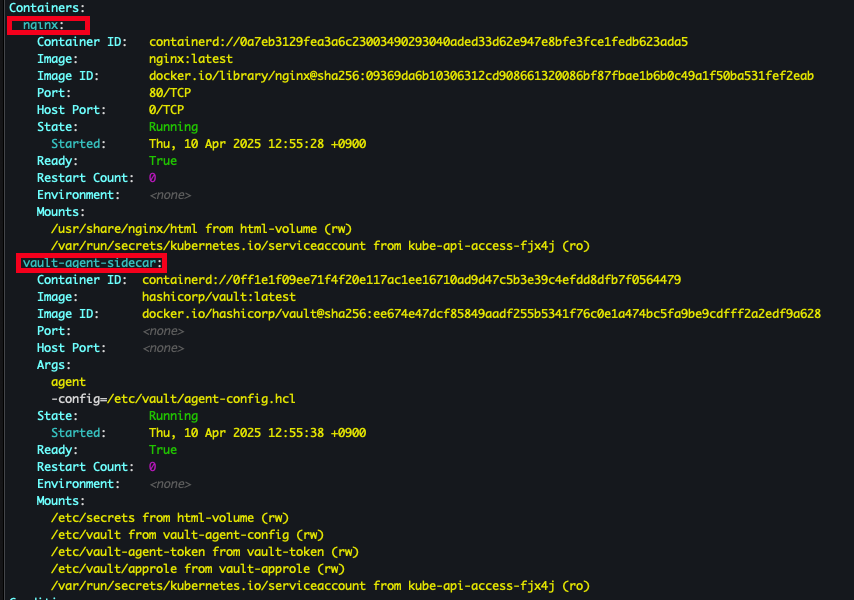 | Vault Agent Sidecar Container | 시크릿을 Vault에서 가져오고 공유 |