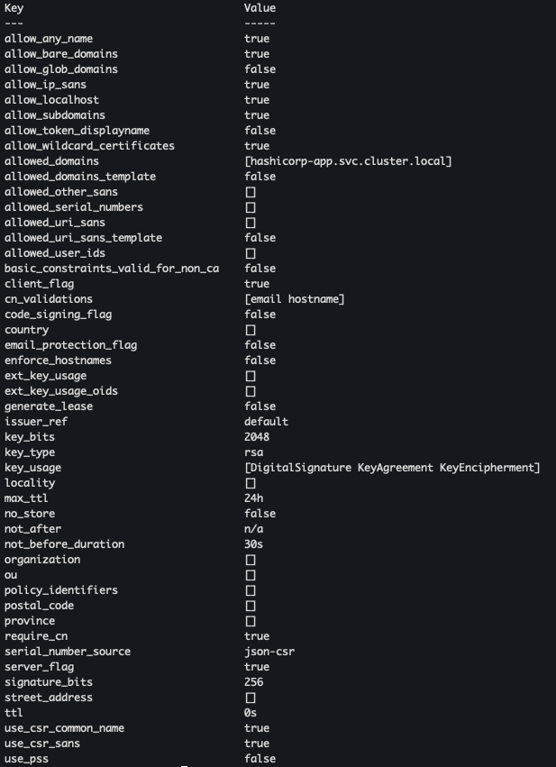 hashicorp-app.svc.cluster.local 도메인 네임에 대해 PKI 엔진에 요청 허용vault write pki/roles/cert-role \