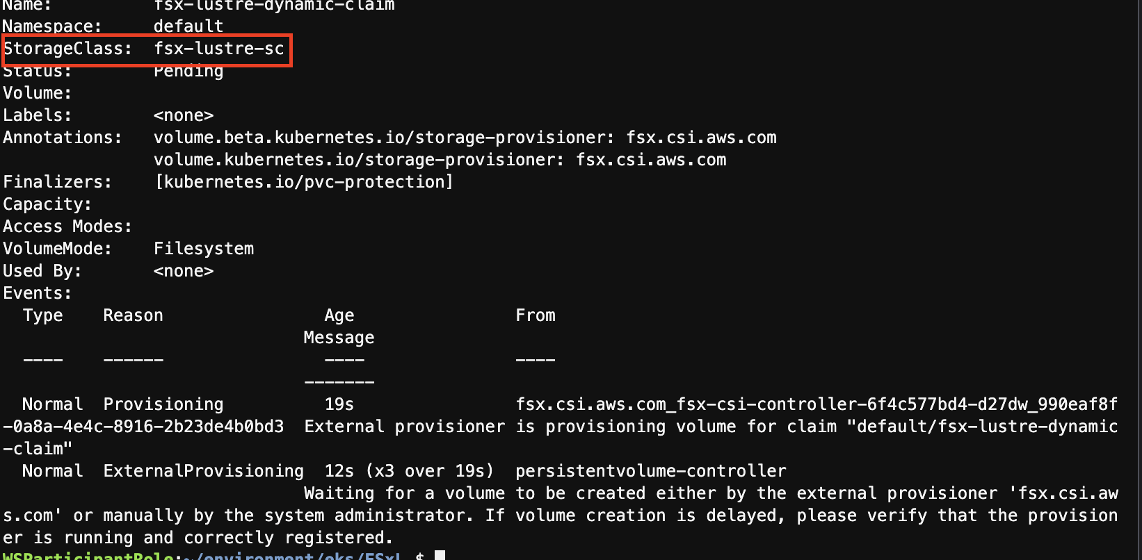 kubectl apply -f fsxL-dynamic-claim.yamlkubectl describe pvc/fsx-lustre-dynamic-claim