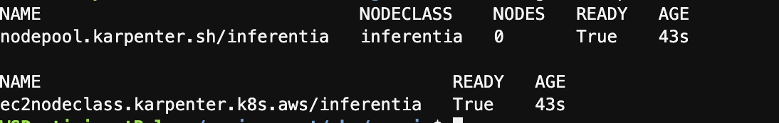 managed-by: karpenterkubectl apply -f inferentia_nodepool.yamlkubectl get nodepool,ec2nodeclass inferentia
