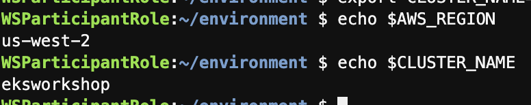 export AWS_REGION=$(curl -s -H "X-aws-ec2-metadata-token: $TOKEN" http://169.254.169.254/latest/meta-data/placement/region)export CLUSTER_NAME=eksworkshopecho $AWS_REGION