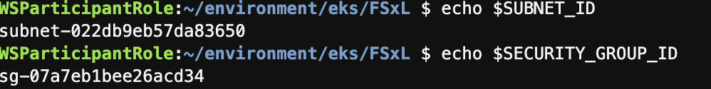 SECURITY_GROUP_ID=$(aws ec2 describe-security-groups --filters Name=vpc-id,Values=${VPC_ID} Name=group-name,Values="FSxLSecurityGroup01" --query "SecurityGroups[*].GroupId" --output text)