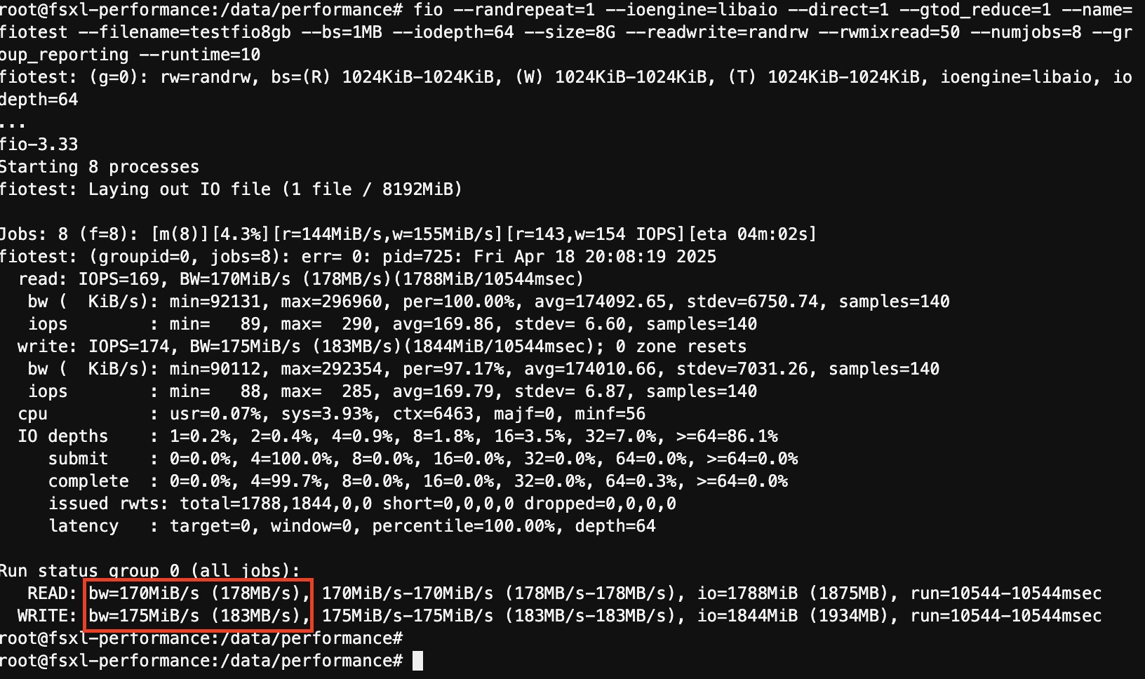fio --randrepeat=1 --ioengine=libaio --direct=1 --gtod_reduce=1 --name=fiotest --filename=testfio8gb --bs=1MB --iodepth=64 --size=8G --readwrite=randrw --rwmixread=50 --numjobs=8 --group_reporting --runtime=10