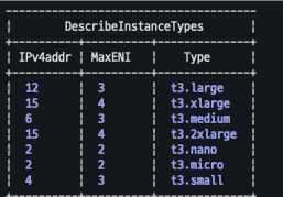 --query "InstanceTypes[].{**Type**: InstanceType, **MaxENI**: NetworkInfo.MaximumNetworkInterfaces, **IPv4addr**: NetworkInfo.Ipv4AddressesPerInterface}" \