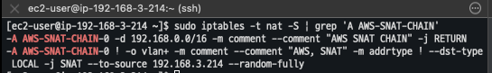 sudo iptables -t nat -S | grep 'A AWS-SNAT-CHAIN