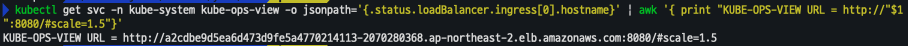 kubectl get svc -n kube-system kube-ops-view -o jsonpath='{.status.loadBalancer.ingress[0].hostname}' | awk '{ print "KUBE-OPS-VIEW URL = http://"$1":8080/#scale=1.5"}'