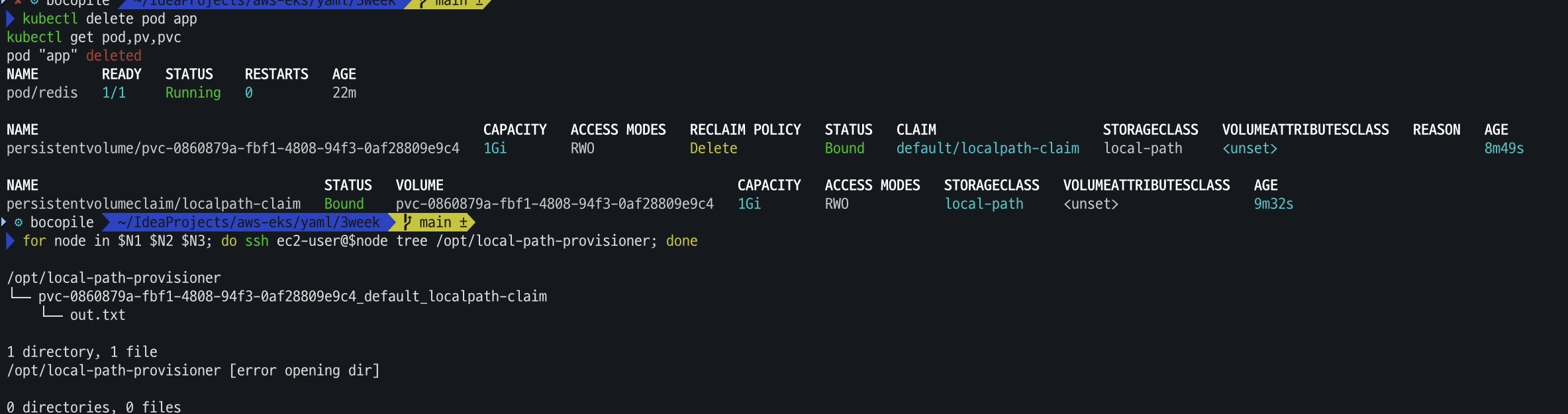 for node in $N1 $N2 $N3; do ssh ec2-user@$node tree /opt/local-path-provisioner; done