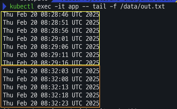 해당 파일이 유지 되나 파드가 삭제 되어 있는 동안에는 로그가 쌓이지 않는 것을 확인 할수 있다.