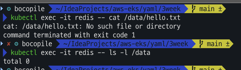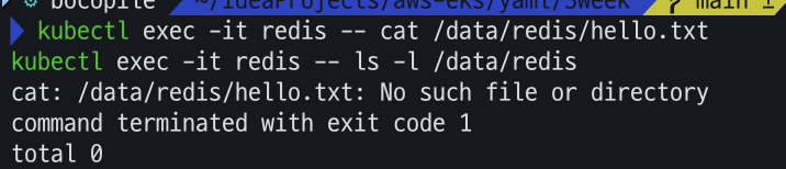 kubectl exec -it redis -- ls -l /data/redis파드를 삭제 하고 재기동 하는 경우 아까 생성 하였던 hello.txt 파일이 존재하지 않음을 확인할수 있다.