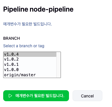 파이프라인을 등록 한 후 처음 실행시 git parameter를 선택 하는 매뉴가 안보이는 버그들이 있습니다.