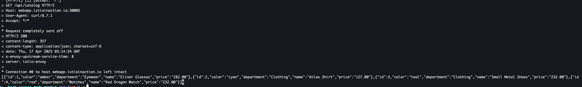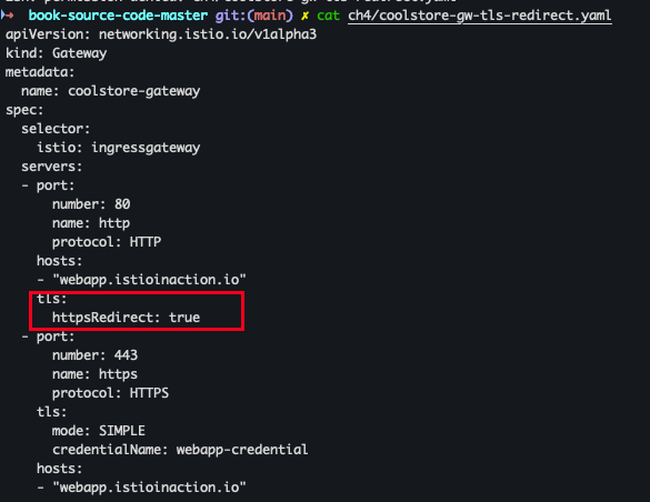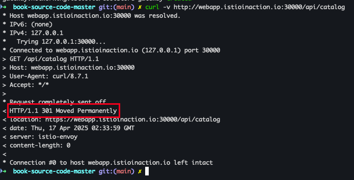 kubectl apply -f ch4/coolstore-gw-tls-redirect.yamlcurl -v http://webapp.istioinaction.io:30000/api/catalog