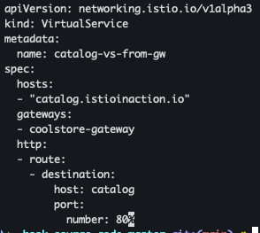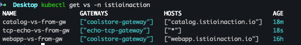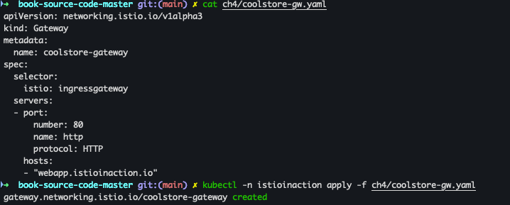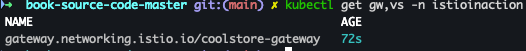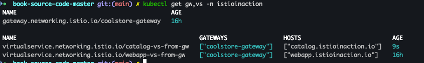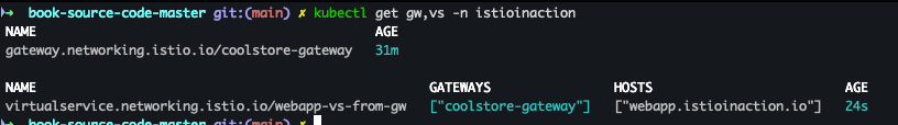kubectl apply -n istioinaction -f ch4/coolstore-vs.yamlkubectl get gw,vs -n istioinaction