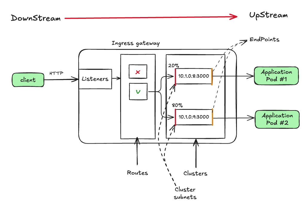 Envoy 트래픽 흐름 : 다운 스트림 → 리스너 → 라우트 → 클러스터 → 업스트림