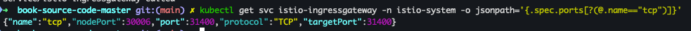 targetPort: 31400kubectl get svc istio-ingressgateway -n istio-system -o jsonpath='{.spec.ports[?(@.name=="tcp")]}'