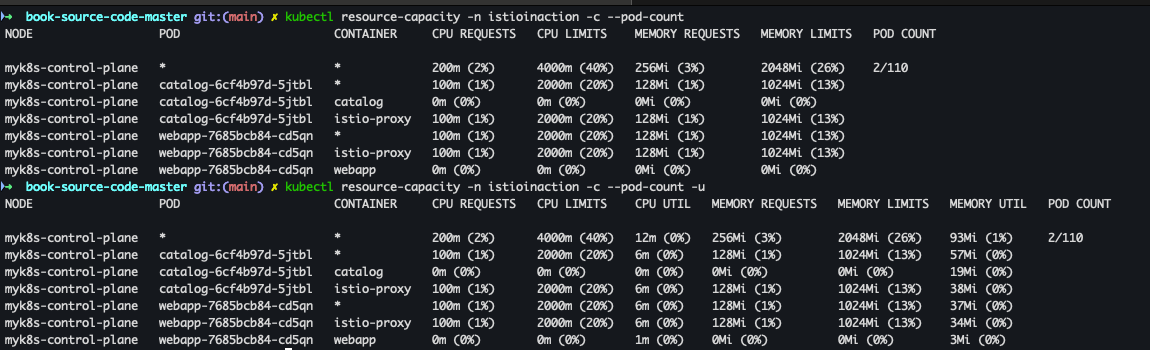 kubectl resource-capacity -n istioinaction -c --pod-count -u