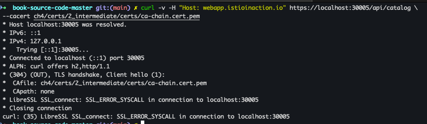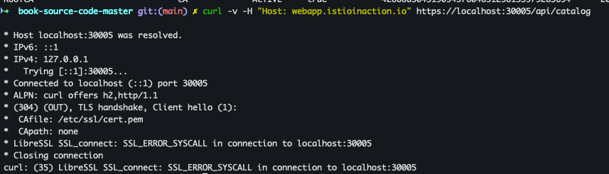 curl -v -H "Host: webapp.istioinaction.io" https://localhost:30005/api/catalog