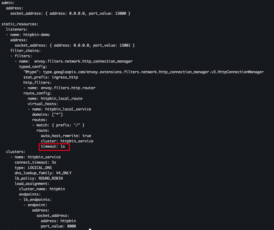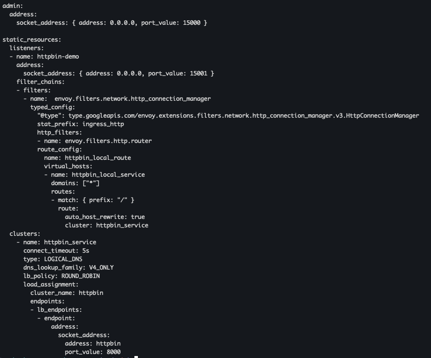 Static Configuration 은 Envoy가 처음 실행될 때 읽어 들이는 설정파일로, 주로 리스너, 라우트, 클러스터, 타임아웃 등의 기본적인 설정을 포함 한다.