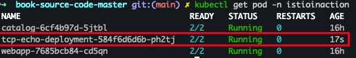 kubectl apply -f ch4/echo.yaml -n istioinactionkubectl get pod -n istioinactionkubectl get pod -n istioinaction
