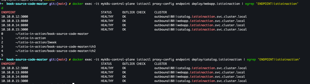 kubectl scale deployment -n istioinaction catalog --replicas 2docker exec -it myk8s-control-plane istioctl proxy-config endpoint deploy/webapp.istioinaction | egrep 'ENDPOINT|istioinaction'