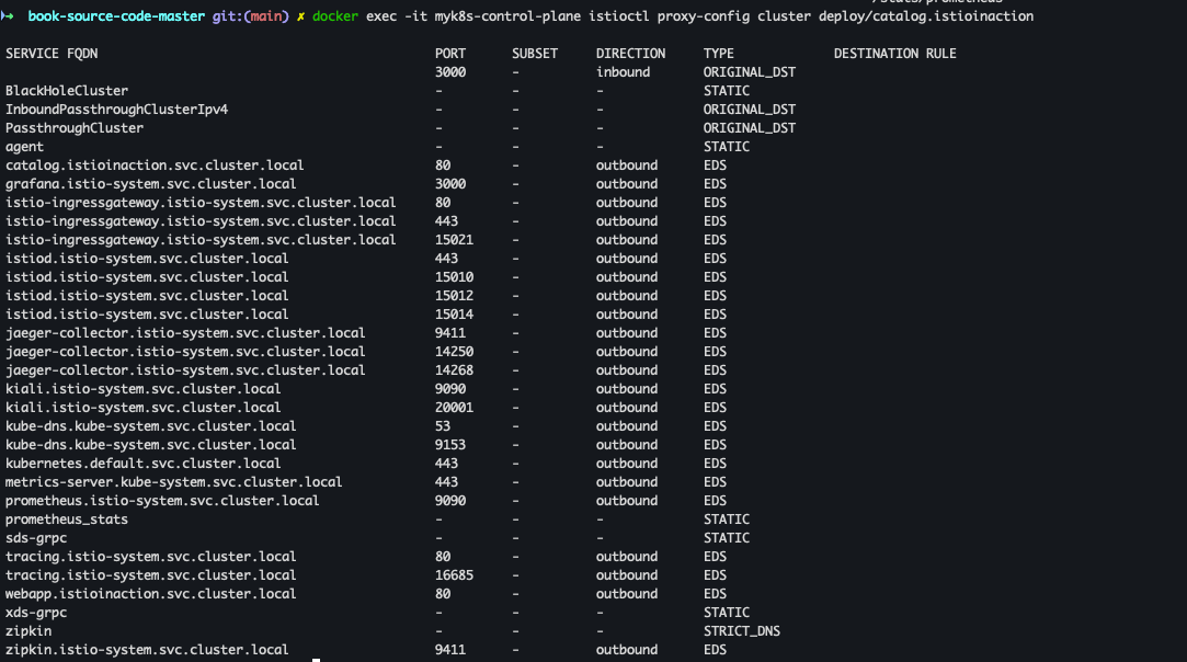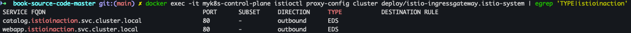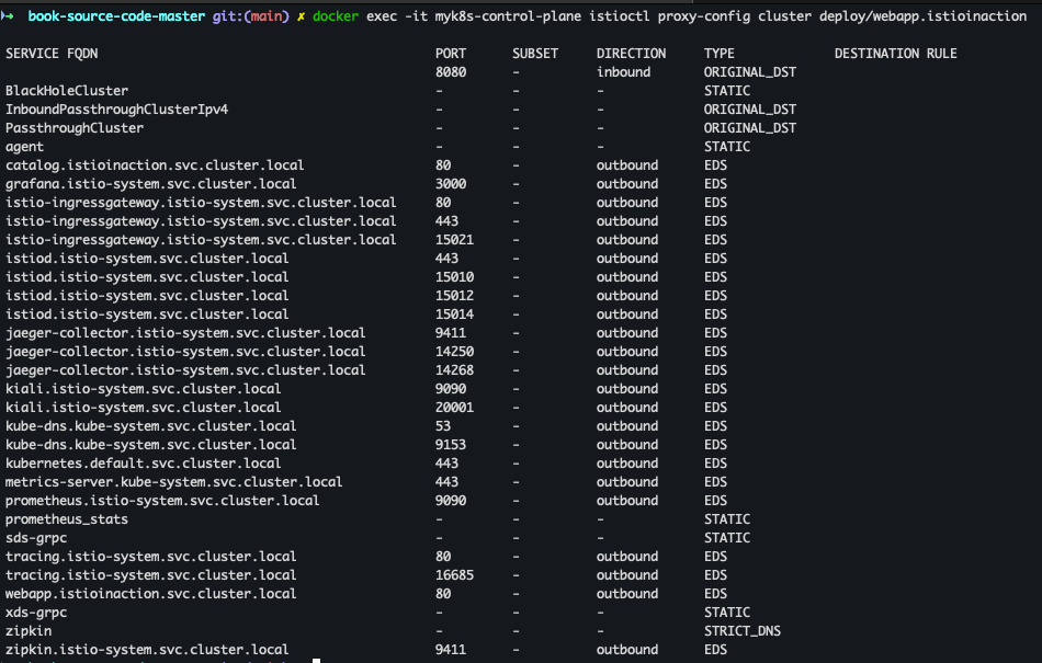 docker exec -it myk8s-control-plane istioctl proxy-config cluster deploy/webapp.istioinaction