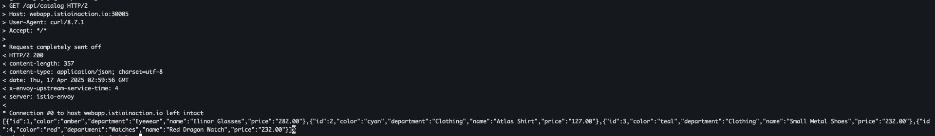 curl -v -H "Host: webapp.istioinaction.io" https://localhost:30005/api/catalog \